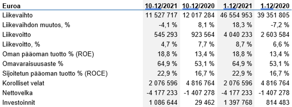 In 2022 net sales is expected to increase and operating profit is expected to remain at the 2021 level. In 2021, net sales were EUR 46.6 million, and operating profit was EUR 4.0 million. However, it is still difficult to make estimates, and the current market conditions are increasing uncertainties over the future.